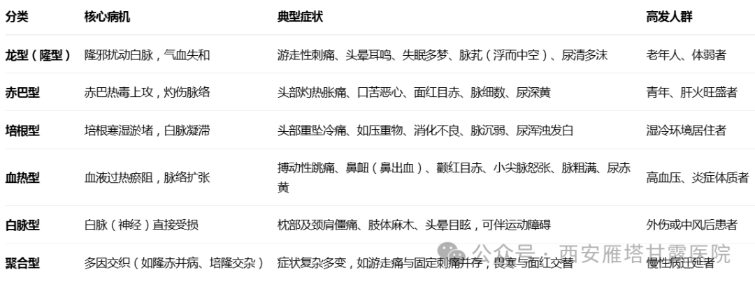 藏医学将头痛分为龙型(隆型)、赤巴型、培根型、血热型、白脉型和聚合型六大类。每类都有独特的病因和临床表现: